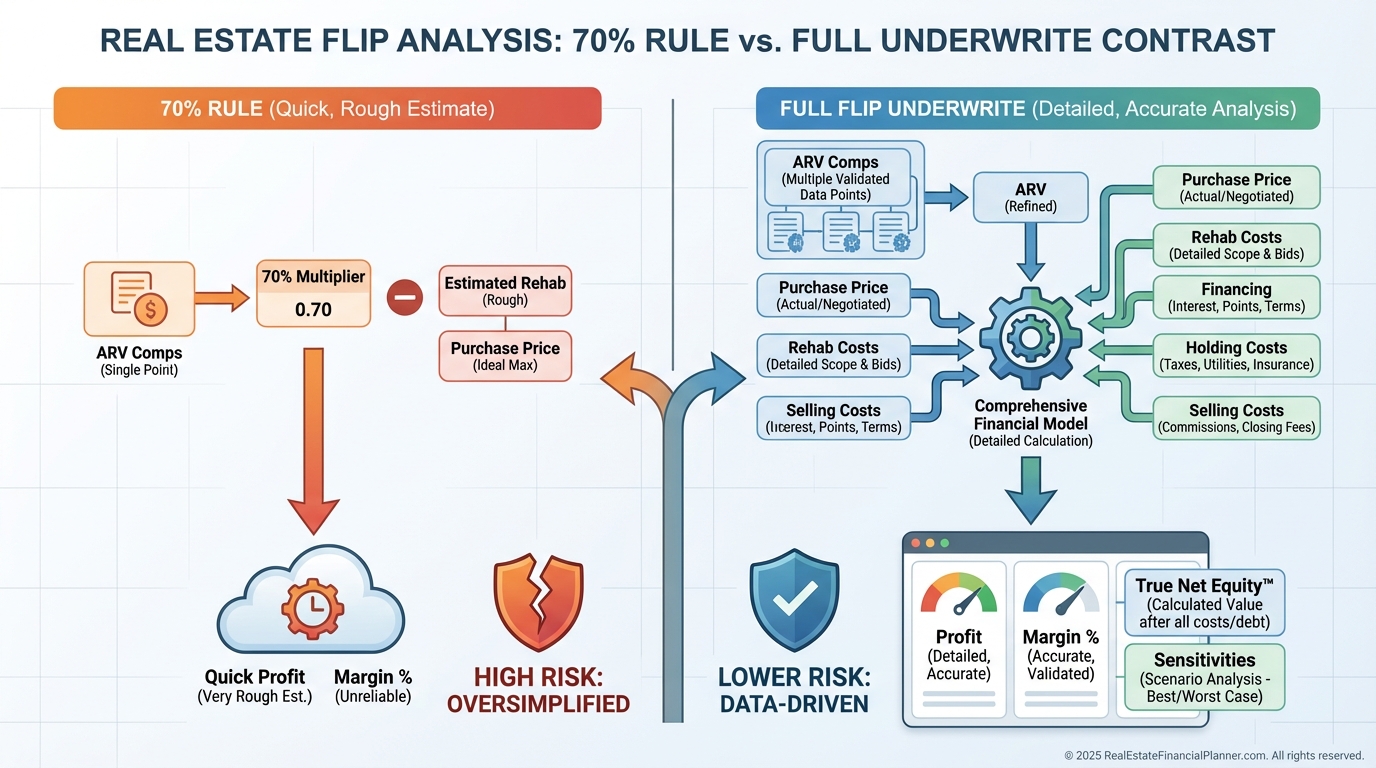 Inputs I require: purchase price, closing costs in/out, rehab by line, financing costs, holding costs, ARV comps with adjustments, and buyer loan seasoning constraints.