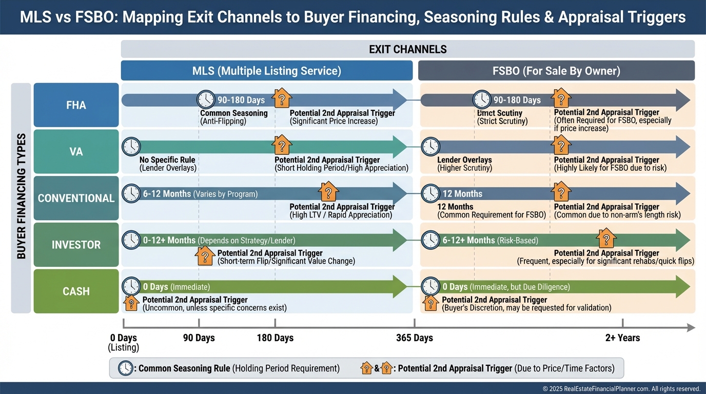 FHA requires 90 days of ownership, and large price jumps can trigger additional documentation or second appraisals between days 91–180.