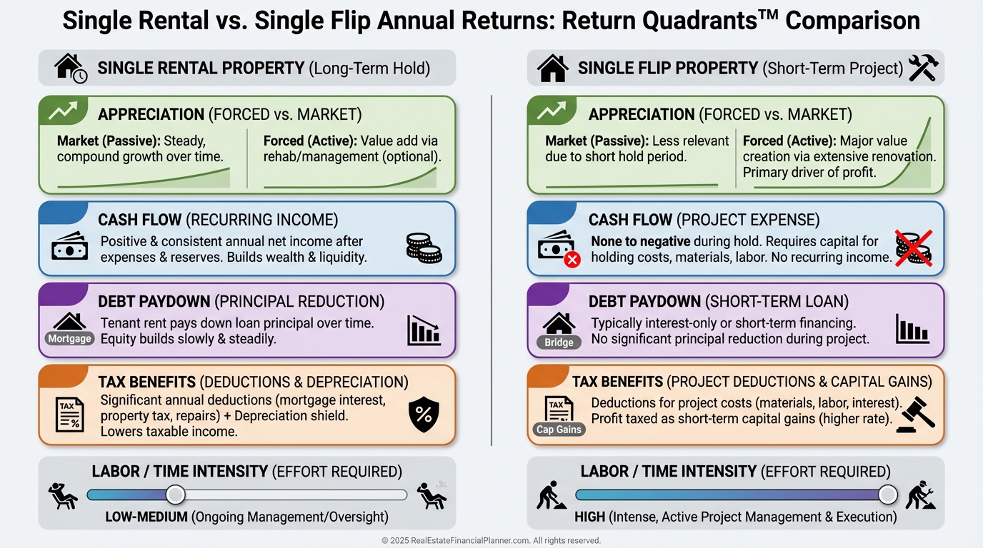 Our modeling in the Real Estate Financial Planner shows one solid rental can rival the annual profit of one average flip.