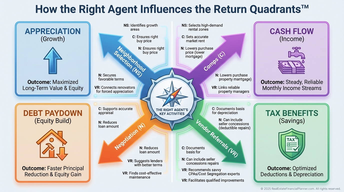 When I help clients, I align agent output to your Return Quadrants™ and True Net Equity™ so you see how each service affects your 1‑, 5‑, and 10‑year outcomes.