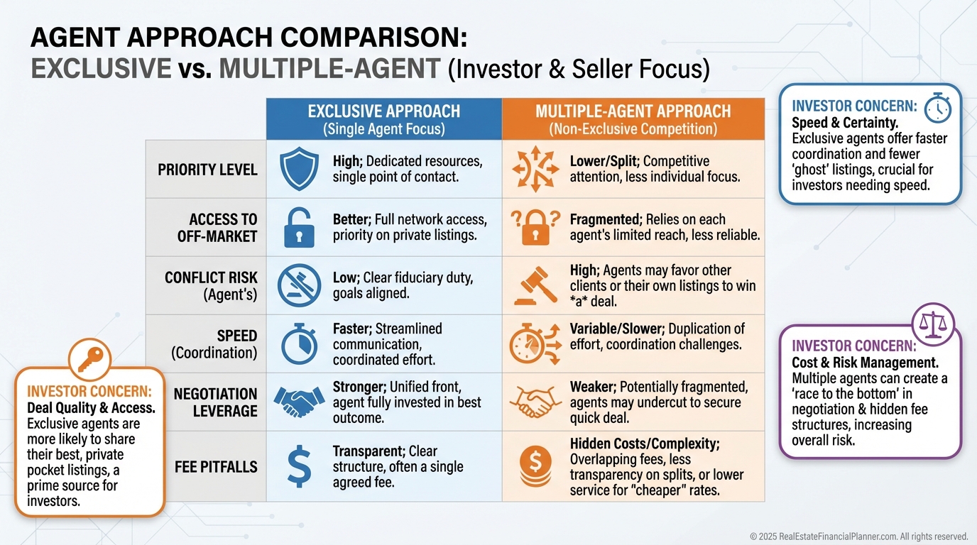 When I represent buyers, exclusive clients get first looks at properties that fit their buy box because I already know their numbers, timeline, and financing.