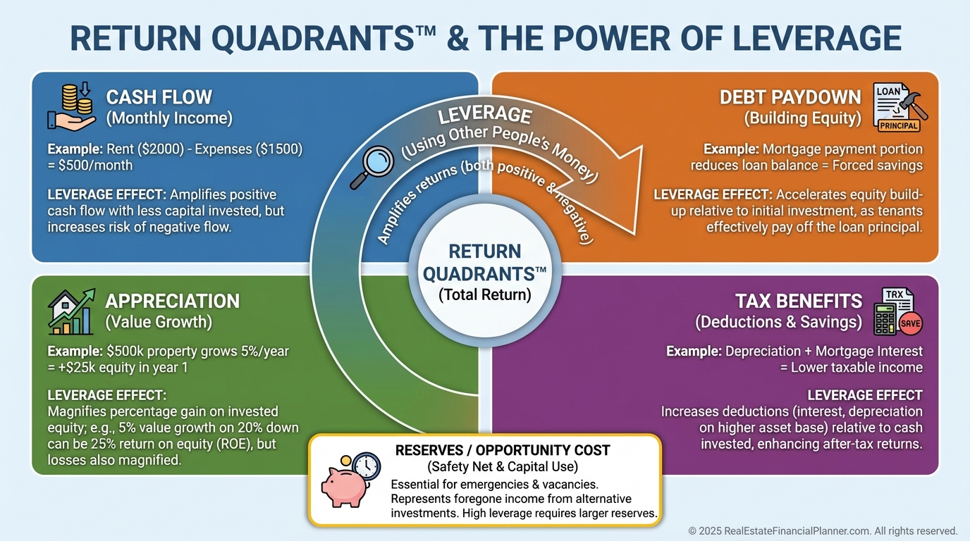 I begin with the Return Quadrants™ to see where the results come from: cash flow, appreciation, debt paydown, and tax benefits.