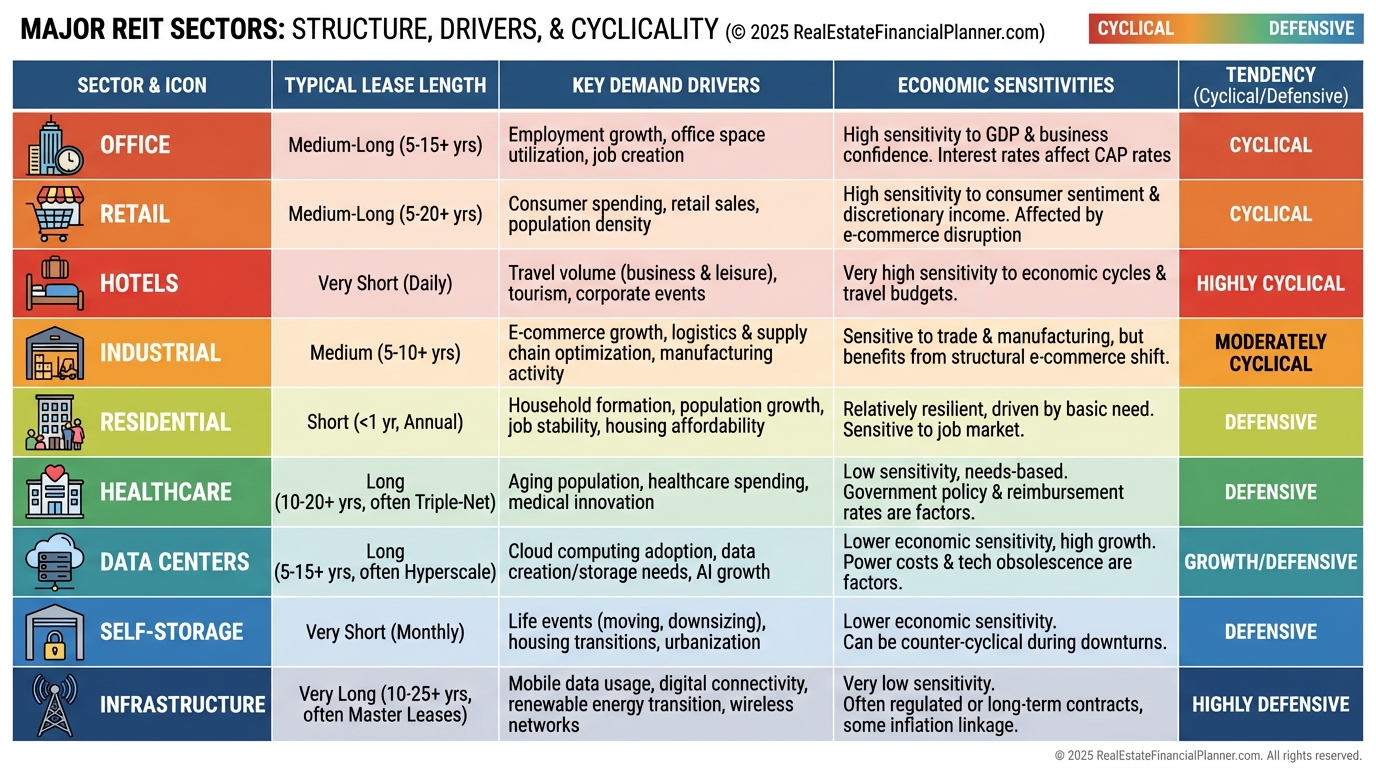 Common sectors include residential, office, retail, industrial, healthcare, data centers, hotels, self-storage, and infrastructure.