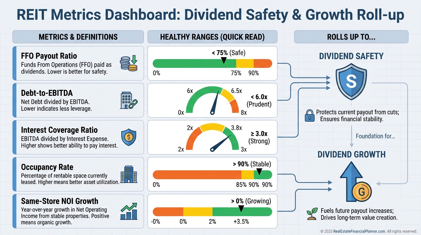 AFFO: Subtracts recurring capital needs from FFO to show sustainable dividend power.