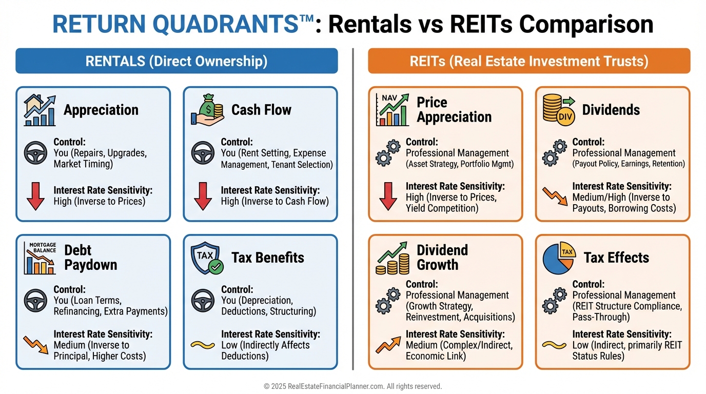 When I compare adding a rental vs a REIT for a client, I line up both Return Quadrants™ over a 10-year horizon.