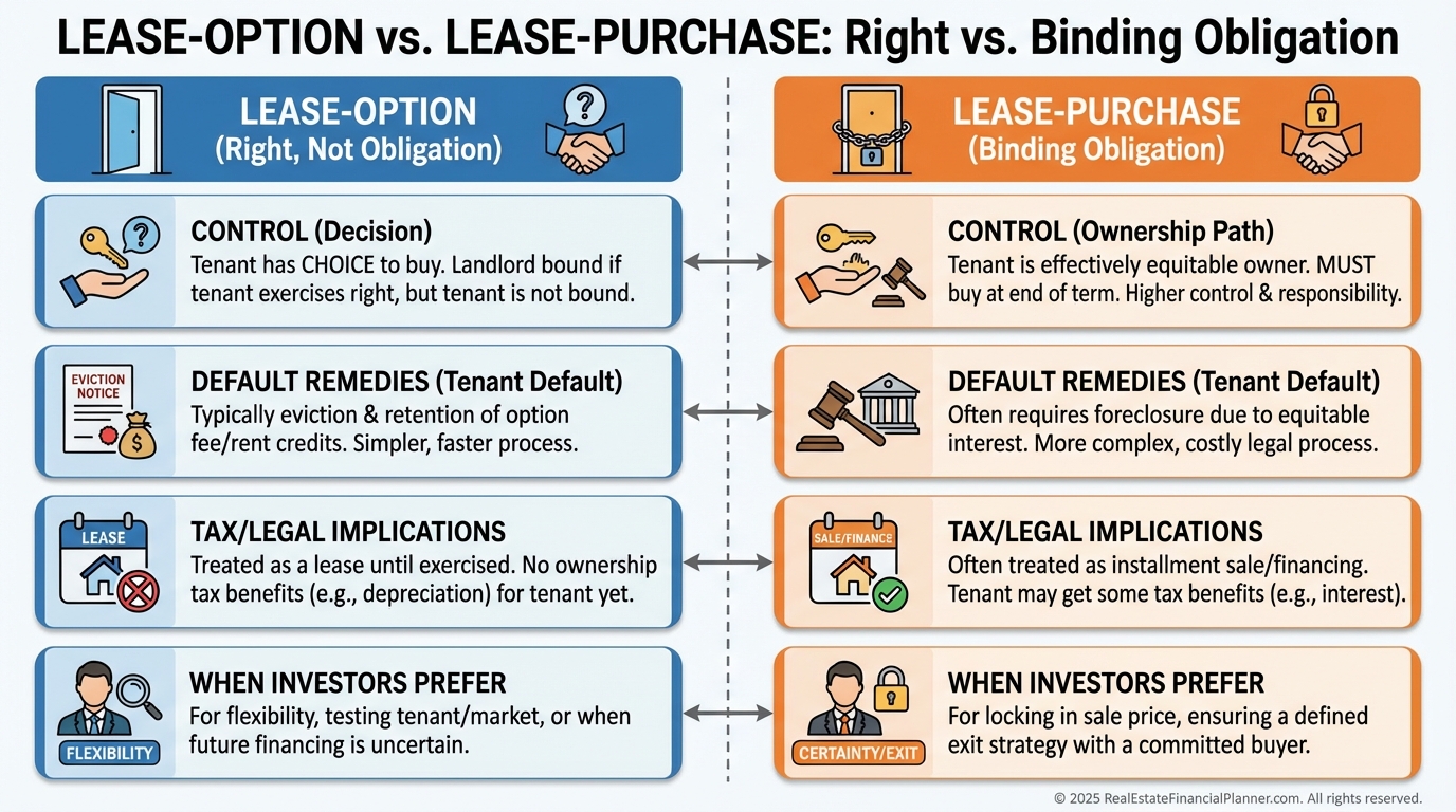 I use separate lease and option documents, clear disclosures, and I avoid granting ownership-type rights before closing.