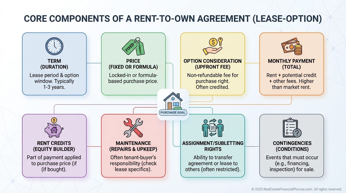 Term length, monthly payment, option consideration, purchase price method, rent credits, and maintenance responsibilities.