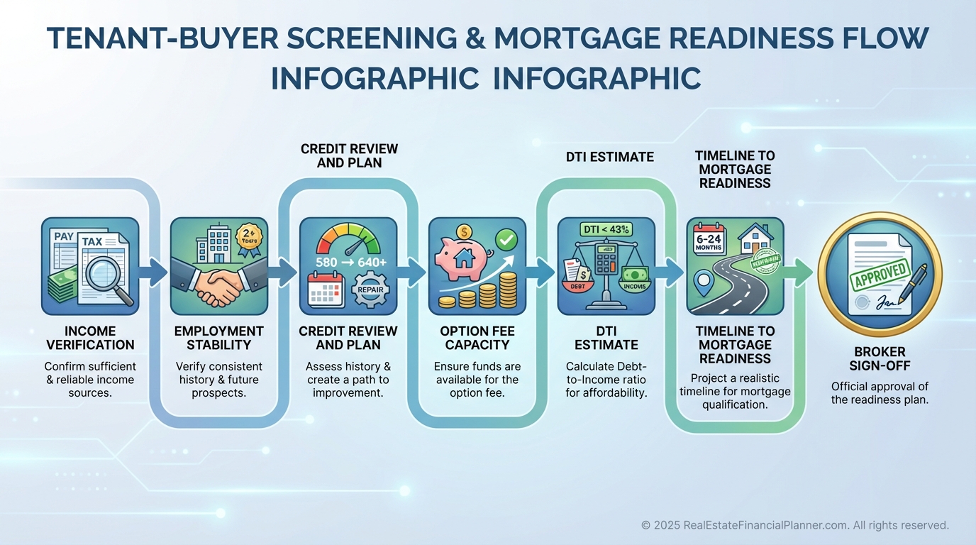 Financially, I want income ≥3x the monthly payment and a meaningful option fee that signals commitment.