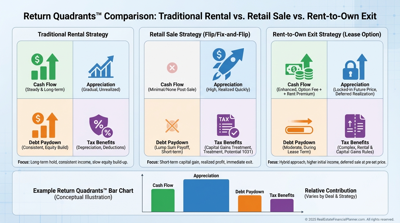 Before anything goes live, I run Return Quadrants™ side-by-side for “keep as rental,” “sell retail,” and “rent-to-own exit.”