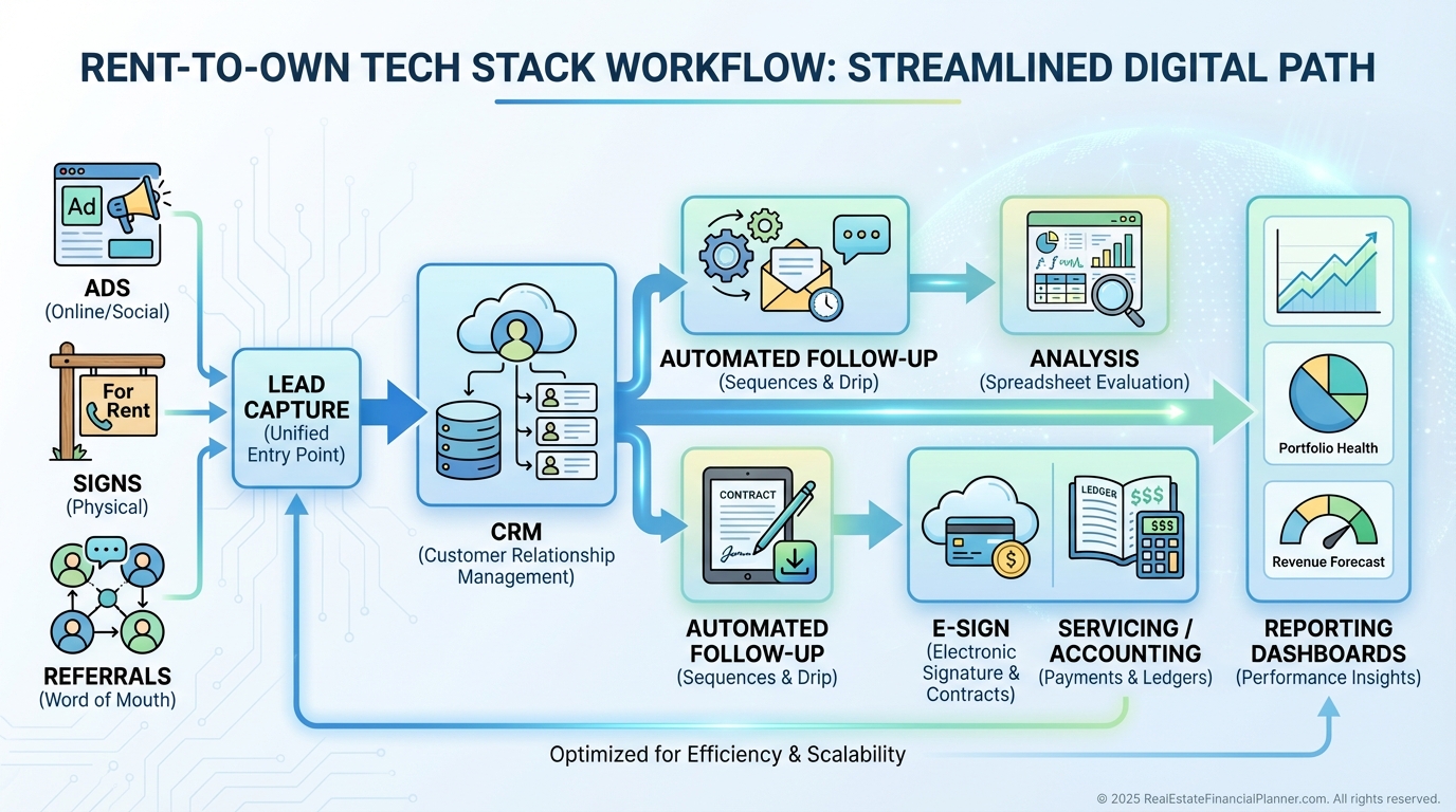 I run lead flow through a CRM and automate follow-ups for both sellers and tenant-buyers.