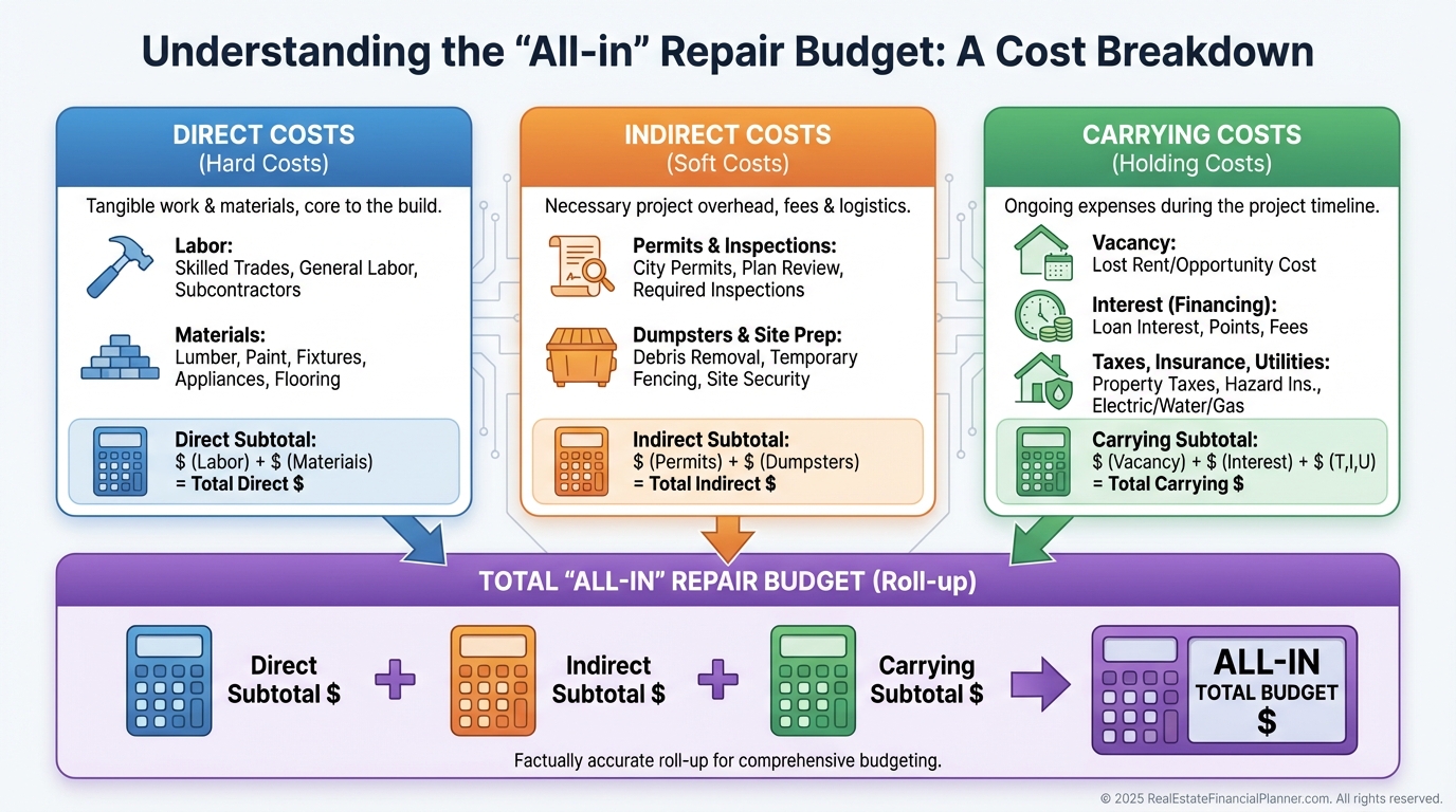 That means materials, labor, permits, inspections, utilities during rehab, vacancy and interest while the unit is down, insurance changes, and lost rent.