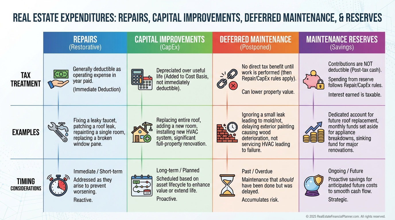 Accelerate repairs in high-income years for deductions, and schedule capital improvements to shelter future passive income.
