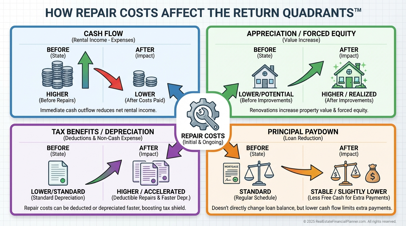 I also show clients how repair timing flows through the Return Quadrants™: cash flow today, appreciation via repositioning, depreciation from improvements, and principal paydown when stabilized.
