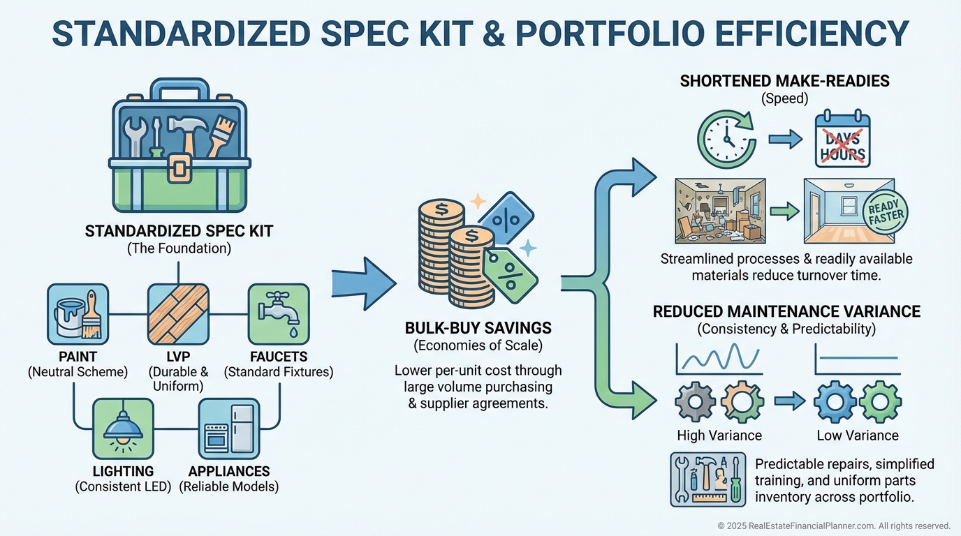 I use the same paint colors, LVP, faucets, fans, and lighting across units and buy in bulk for 20–30% savings.