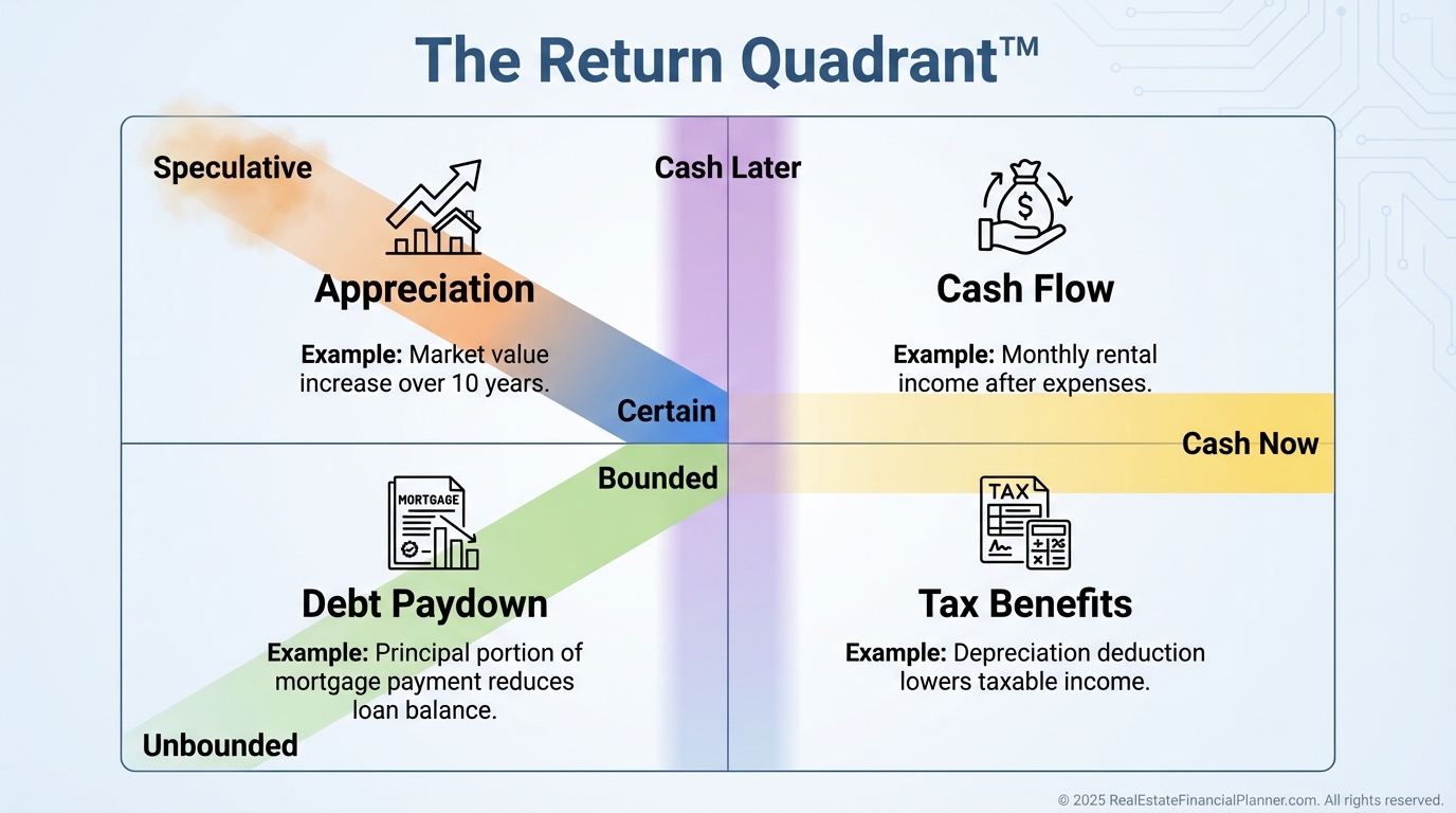 Appreciation and Debt Paydown are “cash later” unless you sell or refinance.