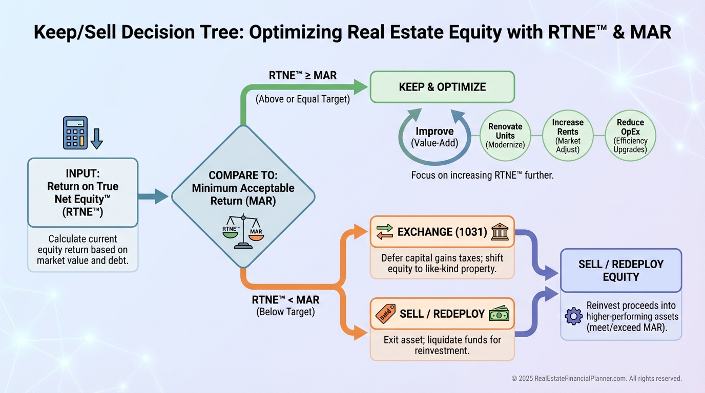 If Return on True Net Equity™ falls below your MAR, we either improve the asset, 1031-exchange into a better one, or sell and redeploy.