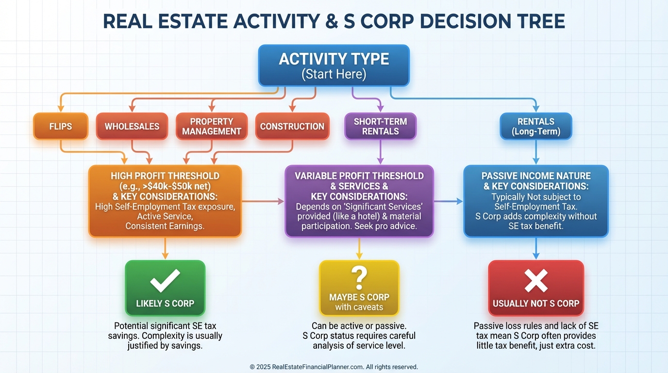 I tell clients to consider S Corp once net profit from active real estate consistently lands above about $60,000–$80,000 per year.