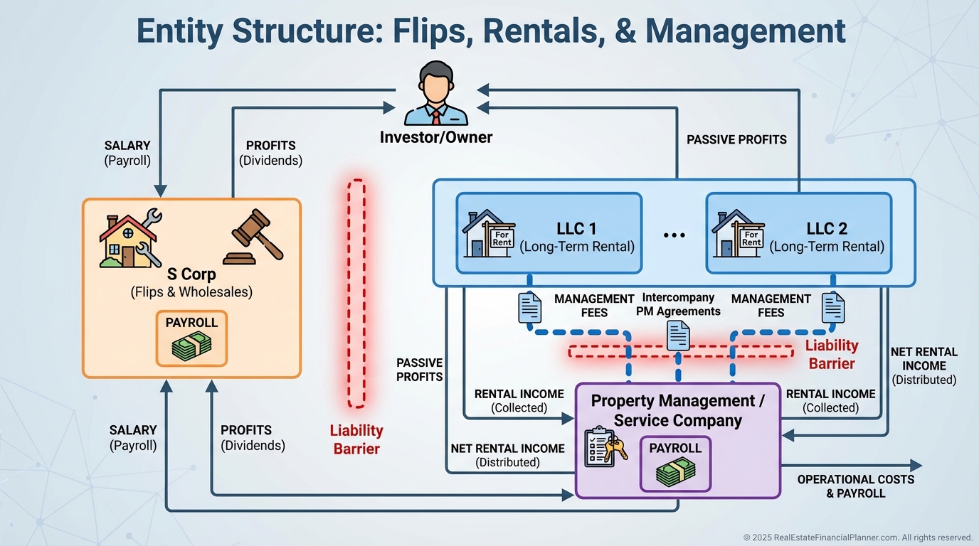 Active income lives in an S Corp. Rentals sit in individual or series LLCs.