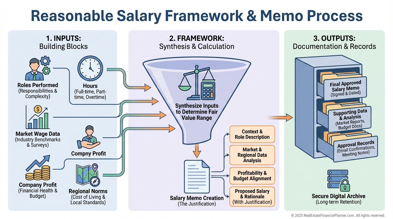 I document hours, roles, and revenue per function. I pull market comps for similar roles, and I reconcile salary to profitability.