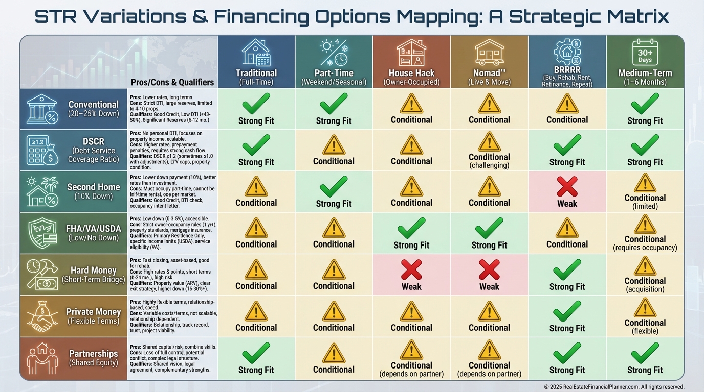 For BRRRR to STR, I often start with hard money, then refi to conventional or DSCR once stabilized.