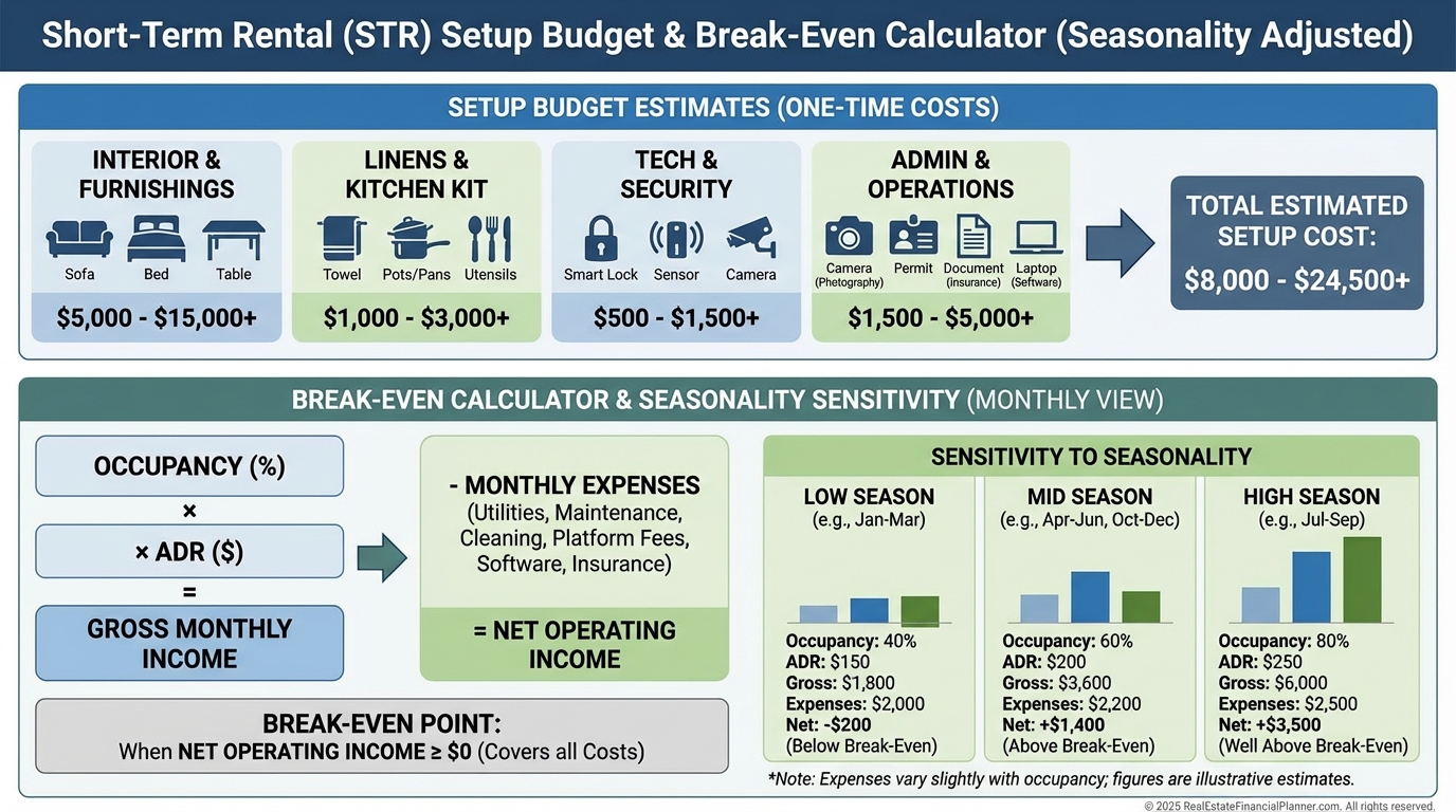 Budget fully for setup, reserves, and a seasonal cash buffer.