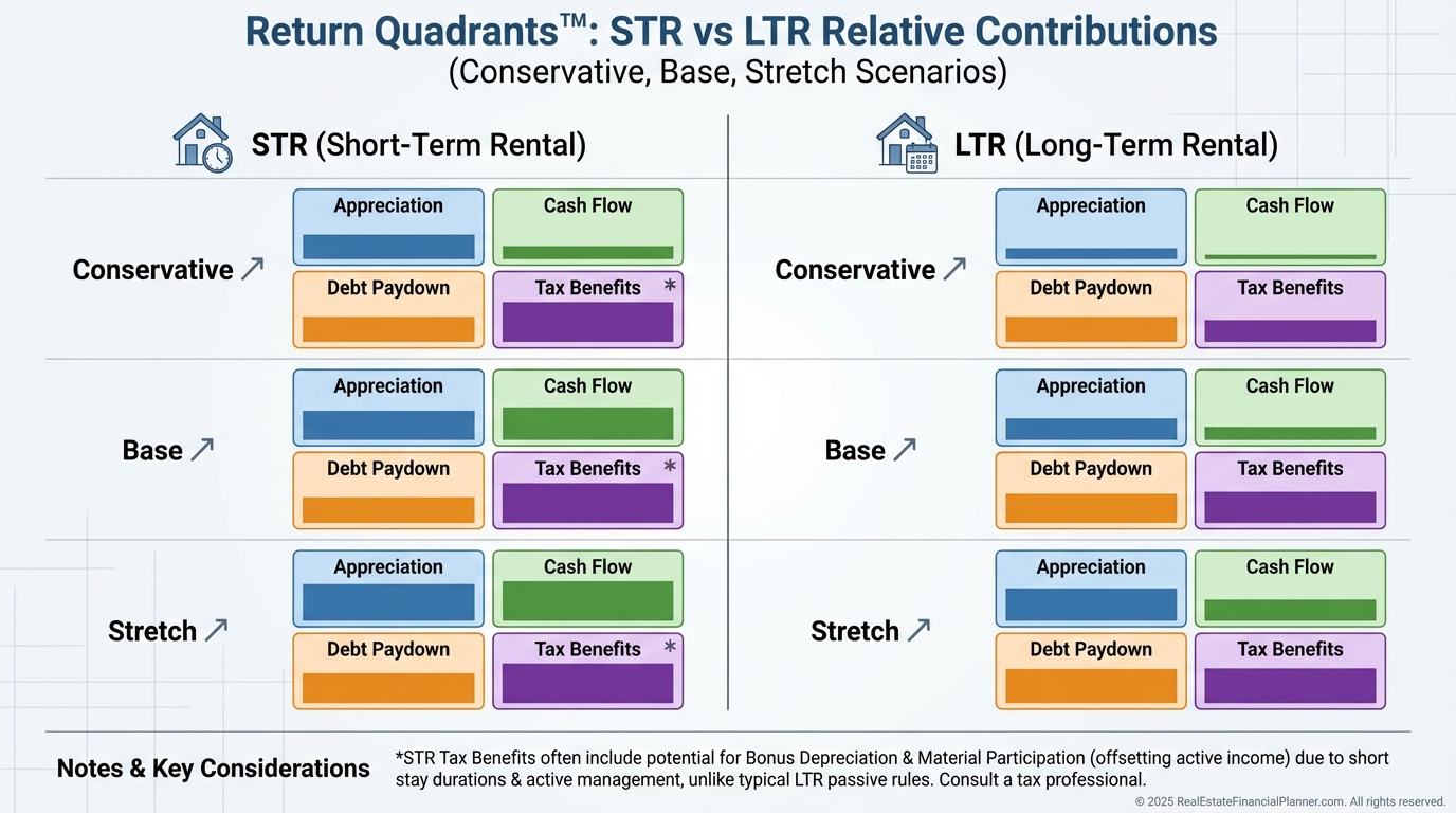 I evaluate four return drivers: Appreciation, Cash Flow, Debt Paydown, and Tax Benefits.