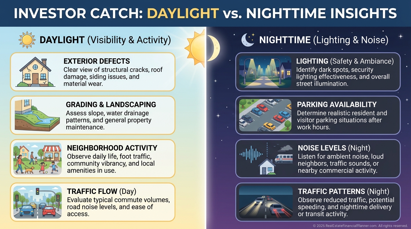 Daylight exposes roof lines, grading, siding, and landscaping, and it reveals interior wear that nighttime lighting hides.
