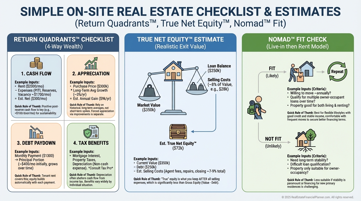 Use Return Quadrants™ to sanity-check the four sources of return: cash flow, appreciation, debt paydown, and tax benefits.