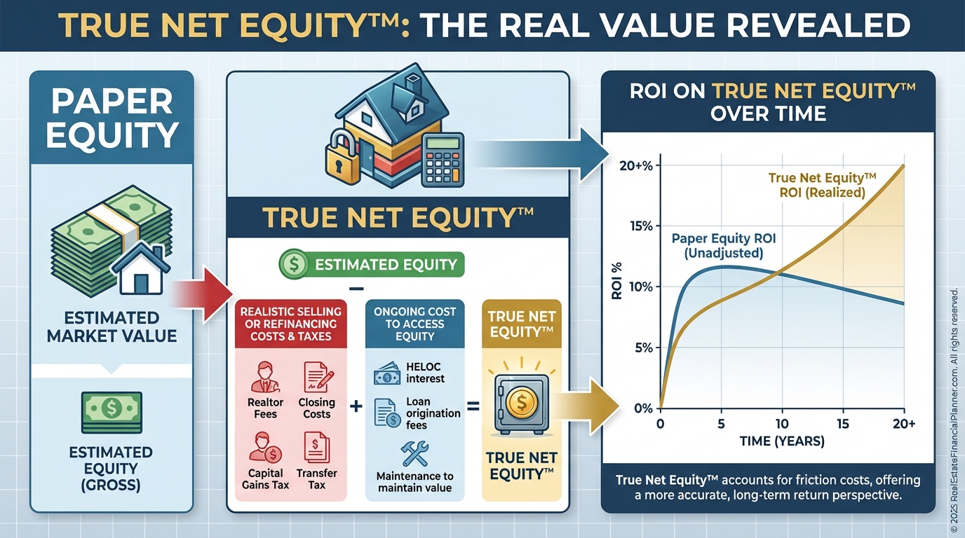 True Net Equity™ is what you can really use after paying transaction costs, taxes, and the friction to access it.