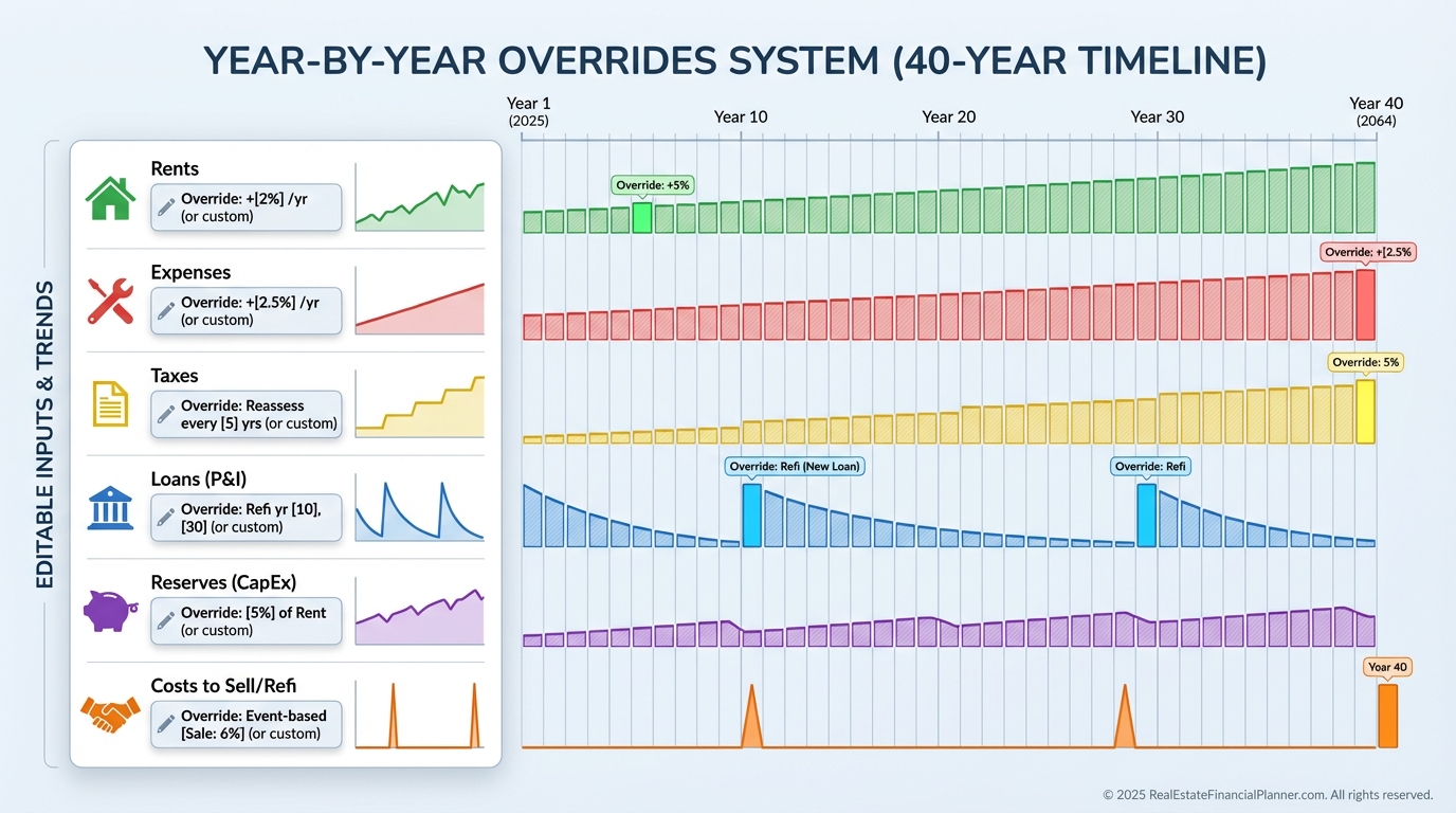 Yet under the hood, you can override everything—taxes, insurance, maintenance, vacancy, PM fees, costs to sell or refinance, rent assumptions, and more—by year.