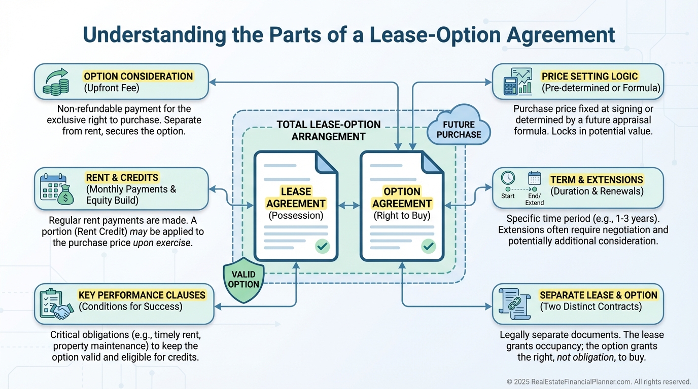 Option Consideration: Usually 3–5% non-refundable, credited at closing, with higher amounts for premium homes or longer terms.