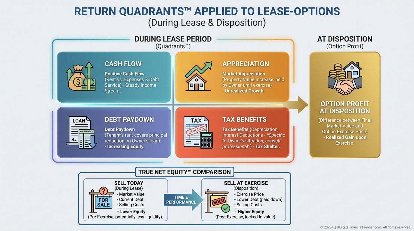 Return Quadrants™ shows my total return from cash flow, appreciation, debt paydown, and tax benefits across the lease term.