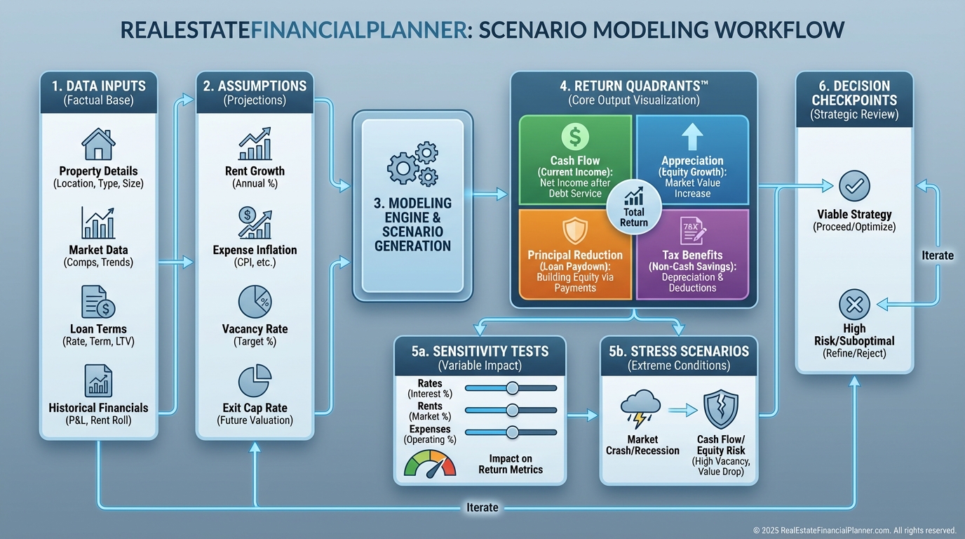 I build base, conservative, and stress scenarios and look at how returns change.