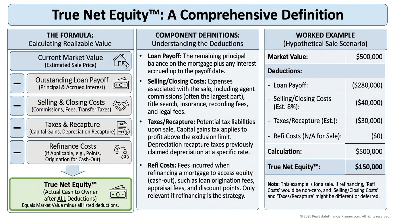 I calculate True Net Equity™ by subtracting closing costs, selling costs, capital gains/depreciation recapture, and refinance costs.