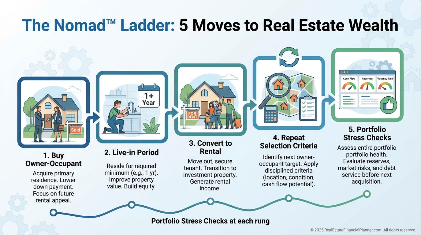 Owner-occupant financing lowers down payments and rates, compounding safely with each move.