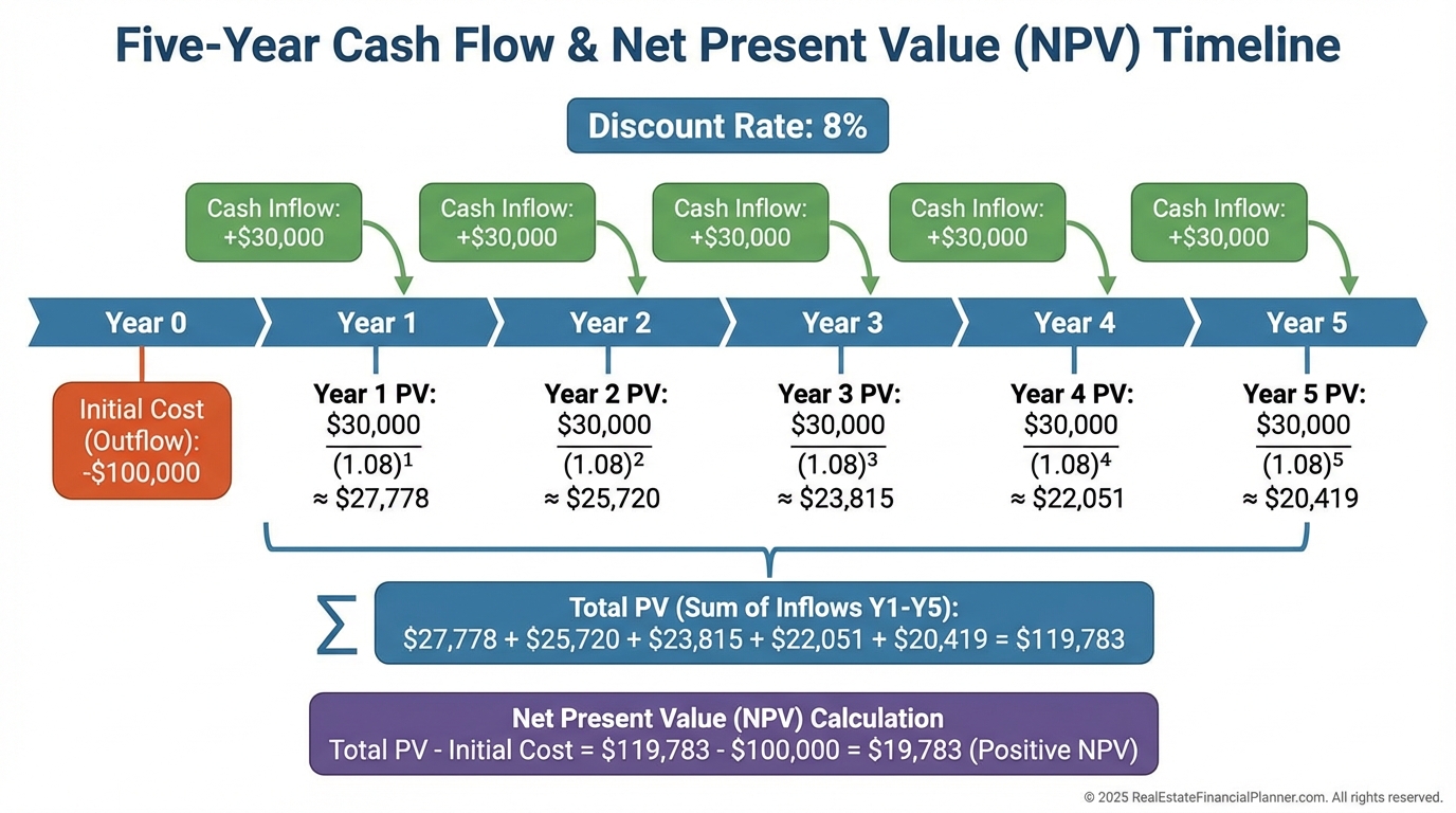 He projects $12,000 annual cash flow for five years and a $250,000 sale in year 5, with an 8% required return.