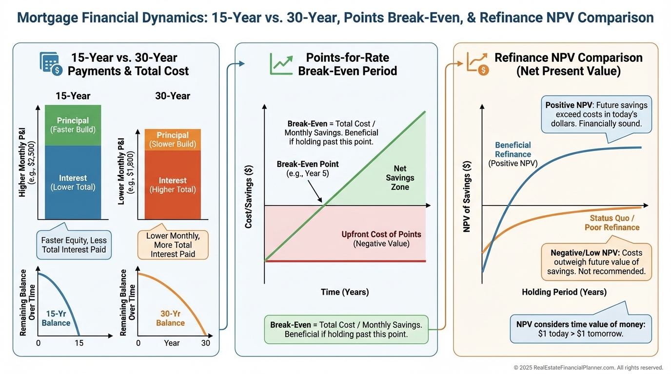 Paying points to drop the rate only wins if the present value of payment savings exceeds the upfront cost before your likely exit.