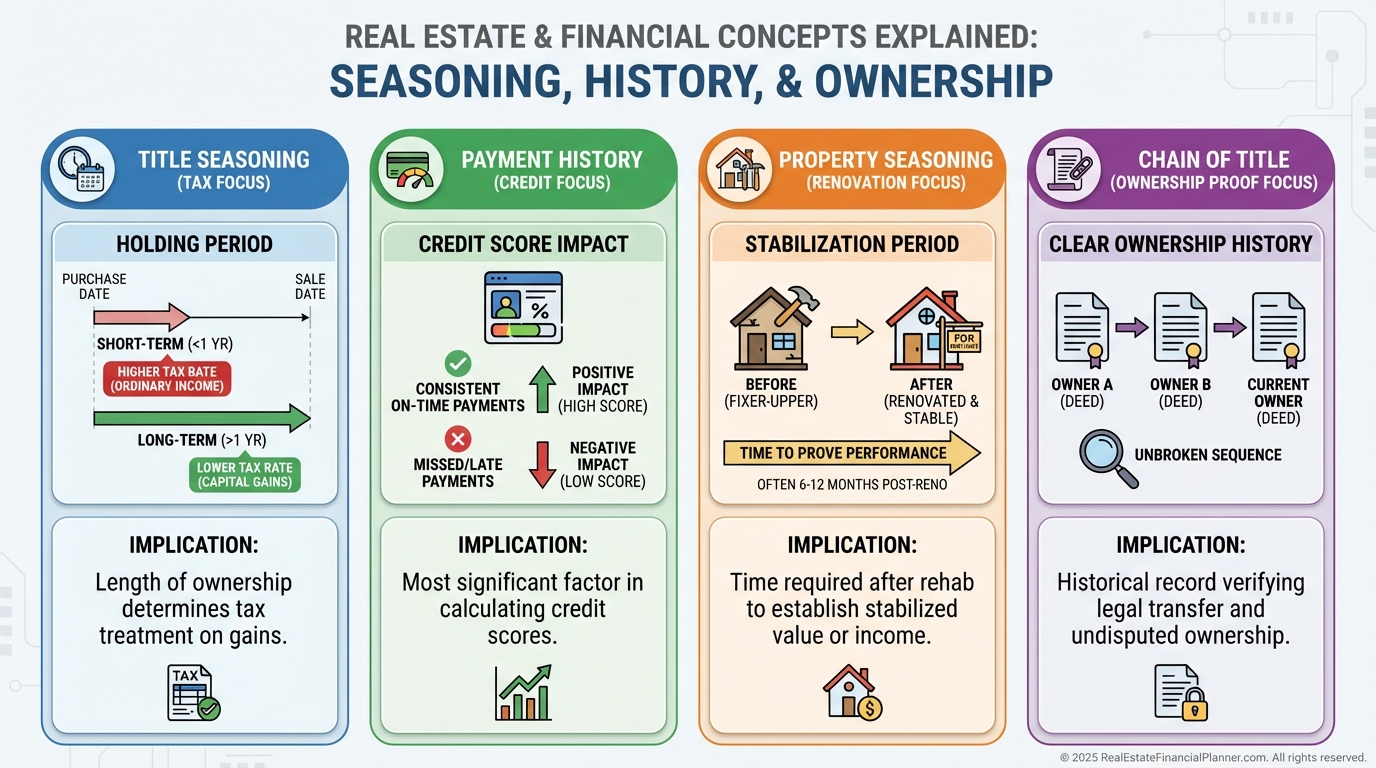 Title seasoning is a lending concept that controls refinance and resale eligibility.