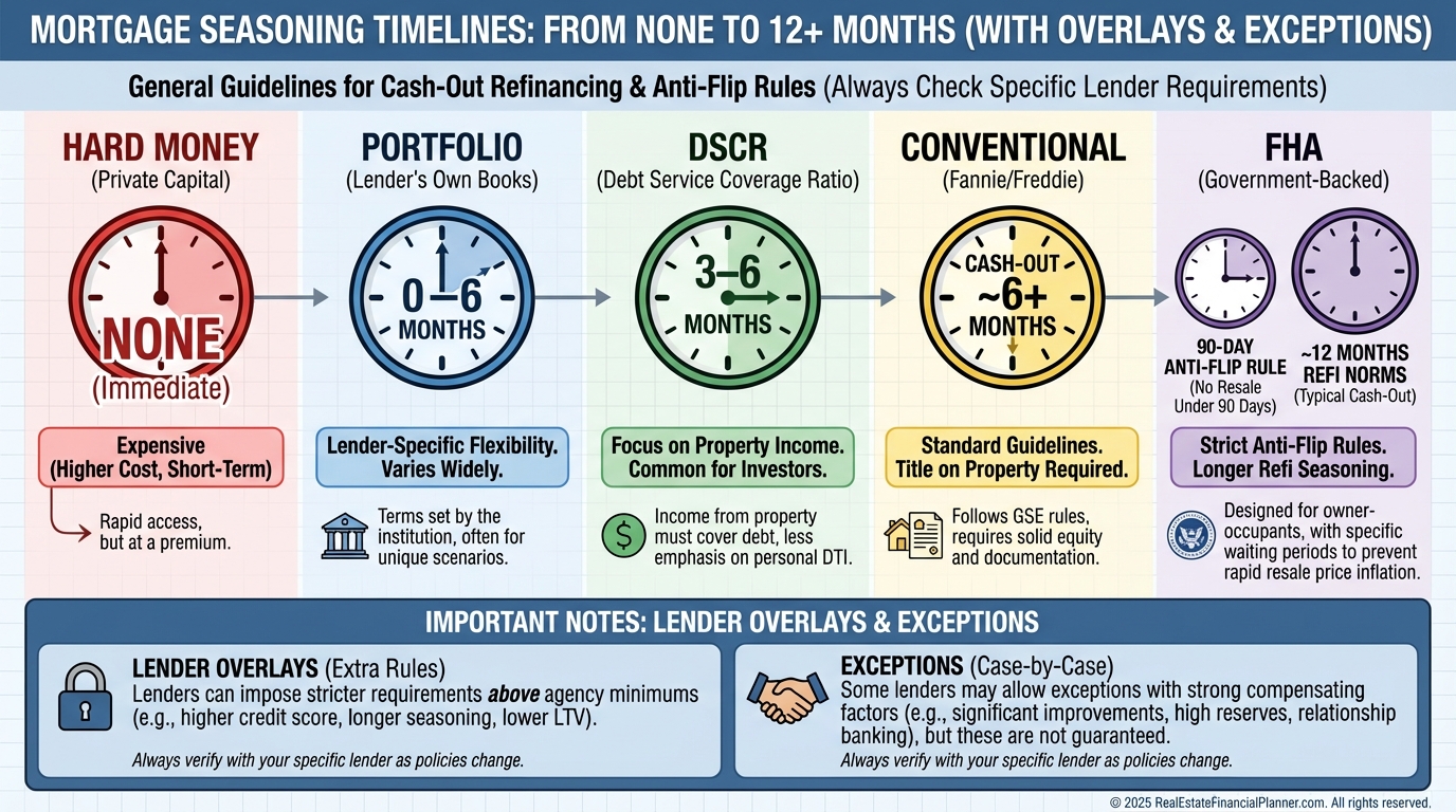 After 2008, lenders tightened seasoning to reduce rapid flip fraud and inflated values.
