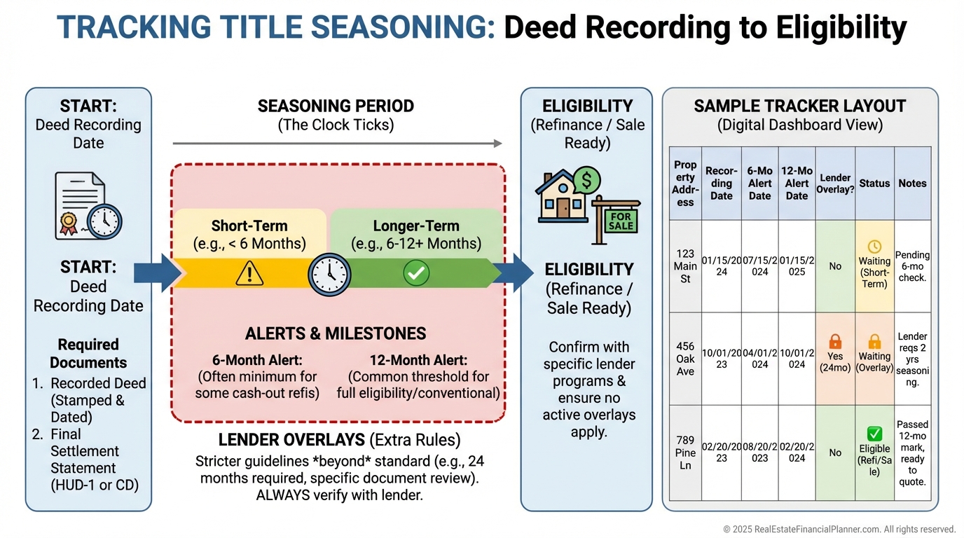 When I build trackers for clients, we add columns for deed recording date, soonest eligible refi date by lender, and any transfer events that could reset seasoning.