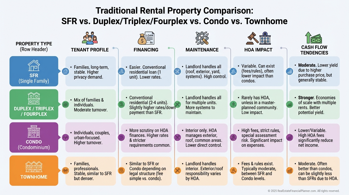 Single-family homes, small multifamily (2–4 units), condos, and townhomes each attract different tenant profiles and maintenance realities.