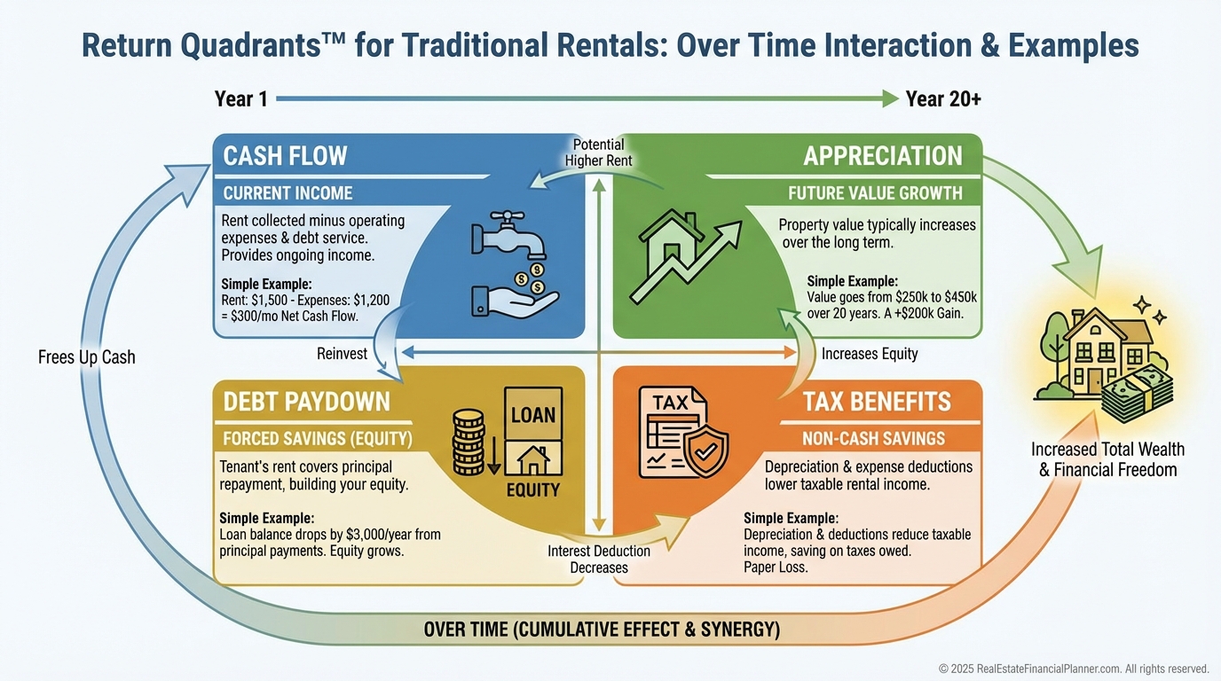 The Return Quadrants™ show the total engine of wealth: cash flow, appreciation, debt paydown, and taxes.