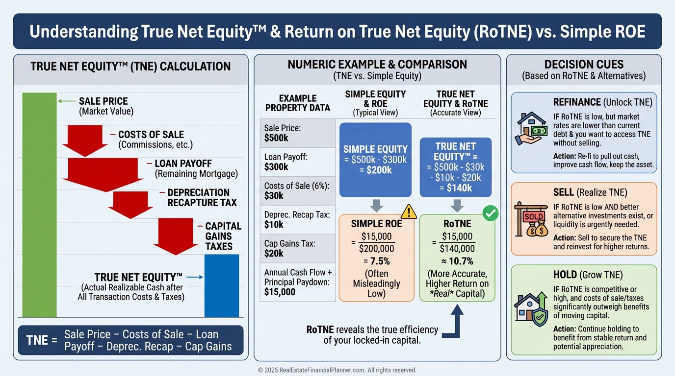 I also calculate True Net Equity™: the equity you could actually access after selling costs, payoff, depreciation recapture, and capital gains.