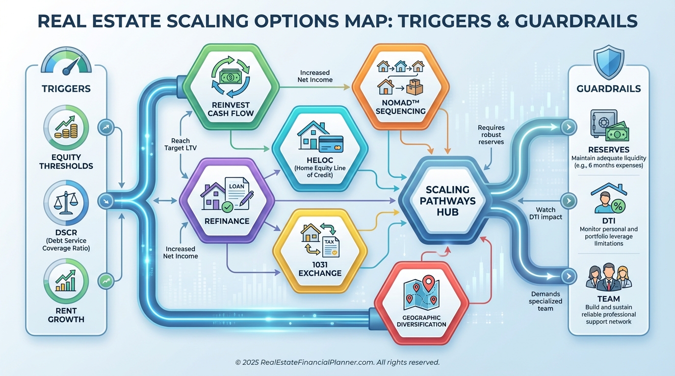 Reinvest cash flow, raise rents with the market, and harvest equity via rate-and-term refis or HELOCs when safe.