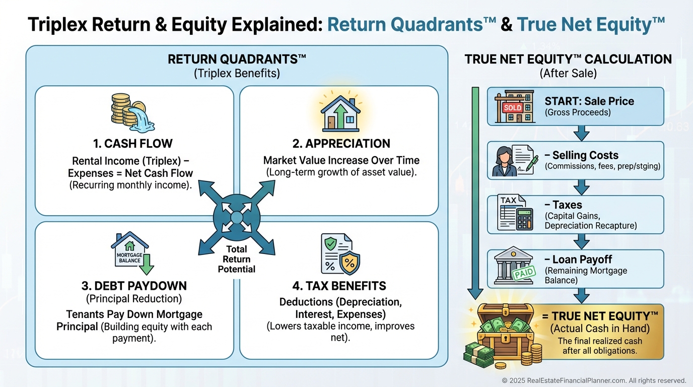 I teach every client to view returns through the Return Quadrants™: cash flow, appreciation, debt paydown, and tax benefits.