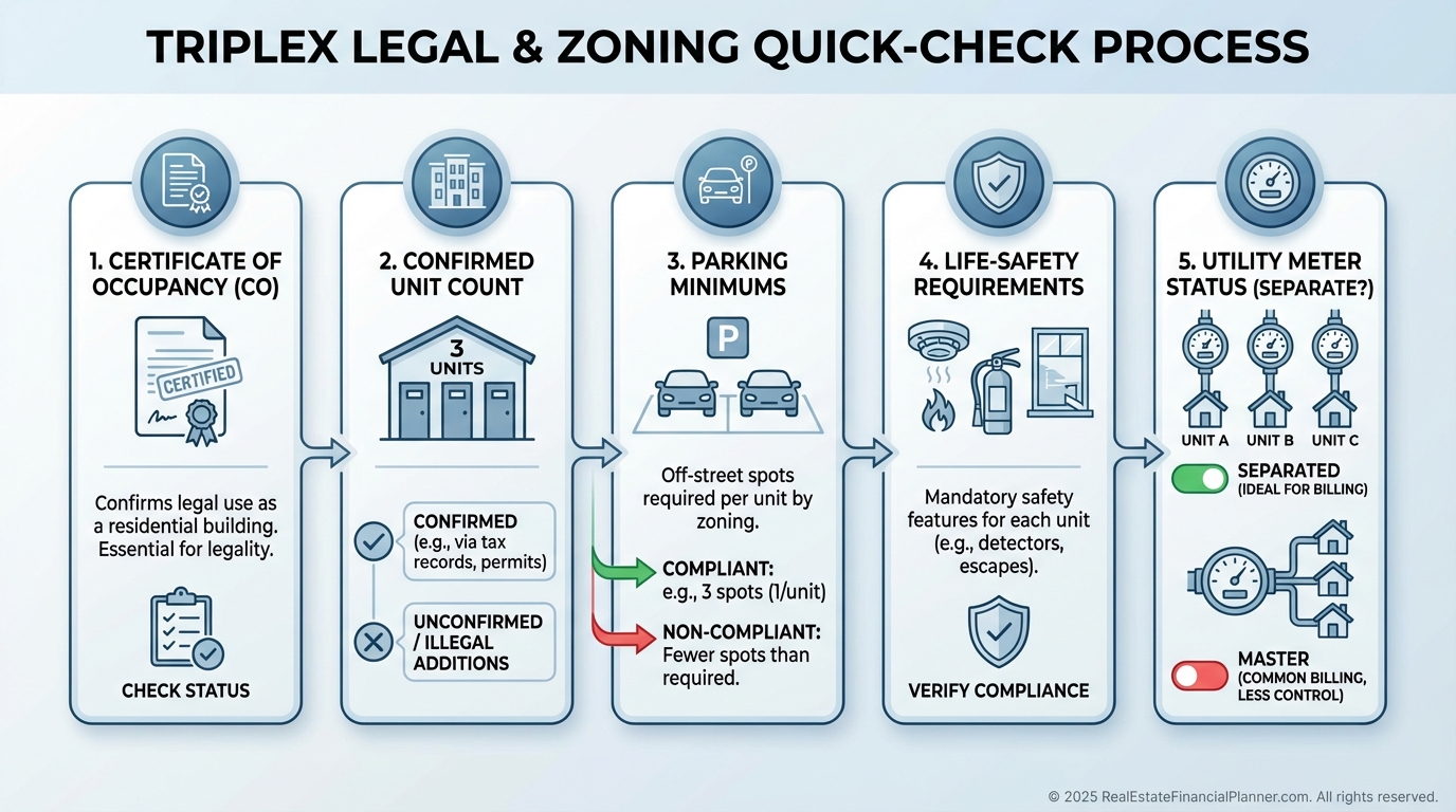 Legality and zoning are non-negotiable. I verify a current certificate of occupancy, unit count on record, and parking compliance before we ever write an offer.