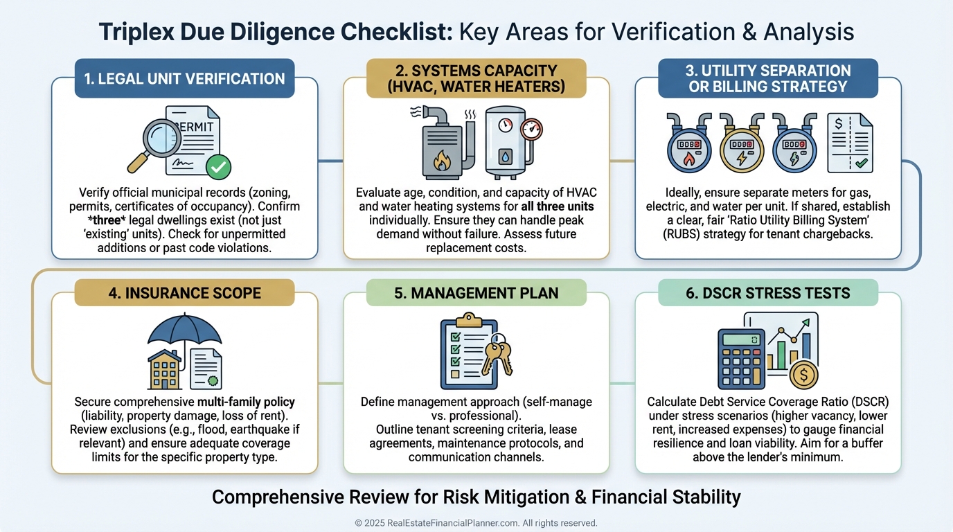 Older triplexes sometimes have “mystery” units that never got permitted. I verify the legal unit count at the city before inspection deadlines.