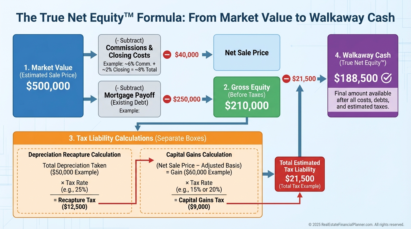 True Net Equity™ = Market Value – Mortgage Balance – Commissions – Seller Closing Costs – Depreciation Recapture Tax – Capital Gains Tax