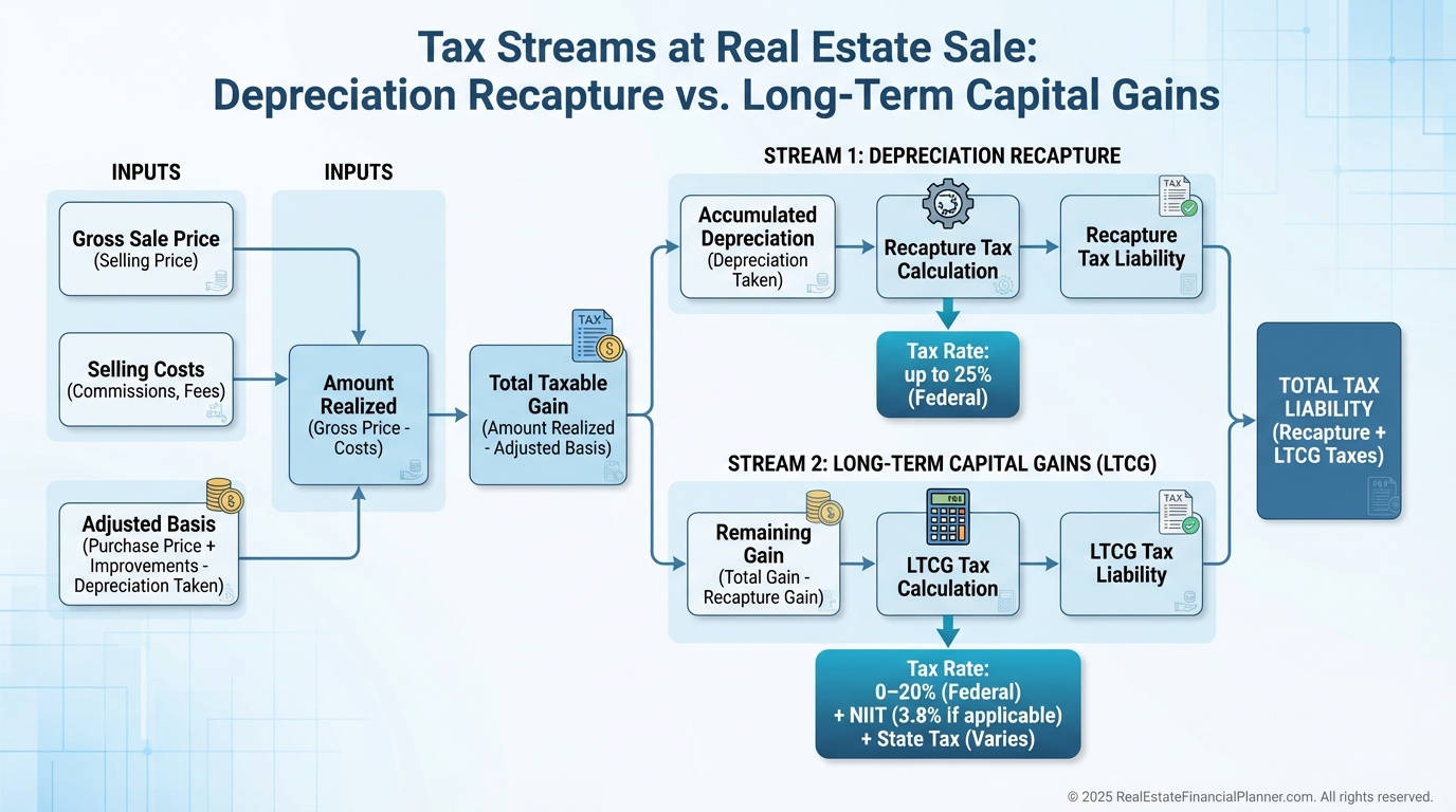 We plug in commission, local closing costs, depreciation schedule, and your tax rates for recapture and gains.