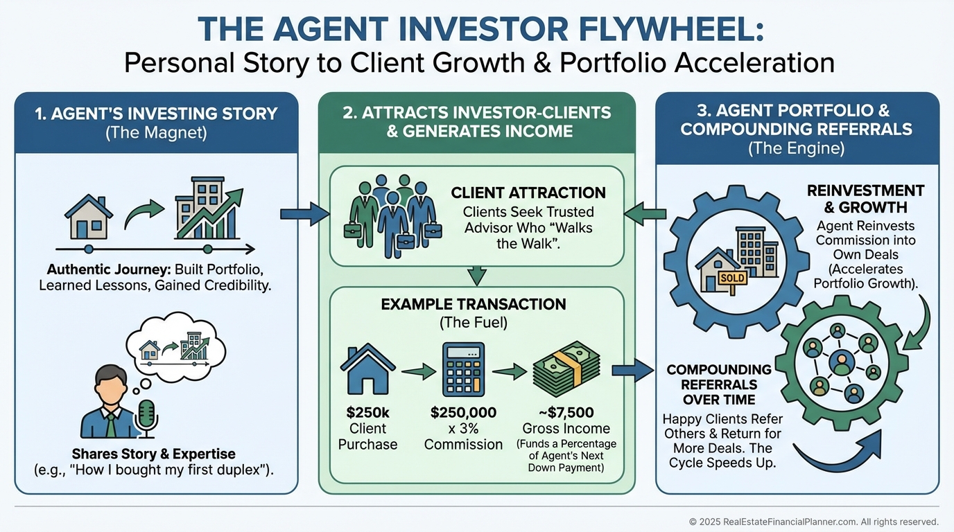 Year 2, your first investor client often appears and their commission funds most of your next down payment.